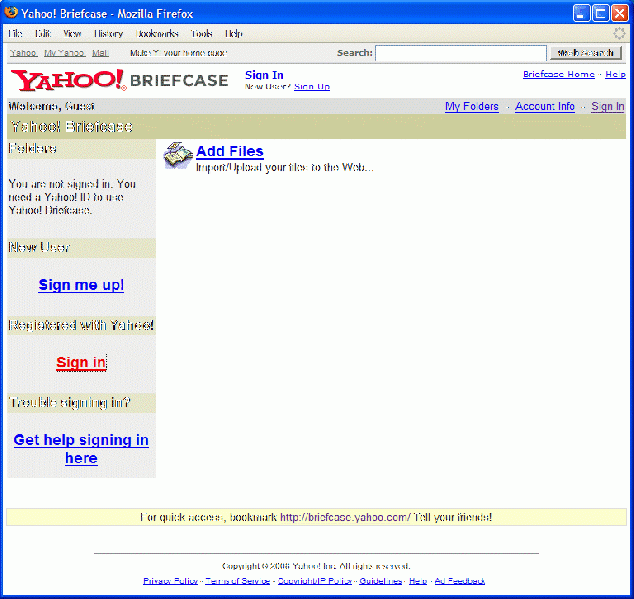A screenshot of the briefcase.yahoo.com ( http://briefcase.yahoo.com ) homepage taken at an unknown date/time.